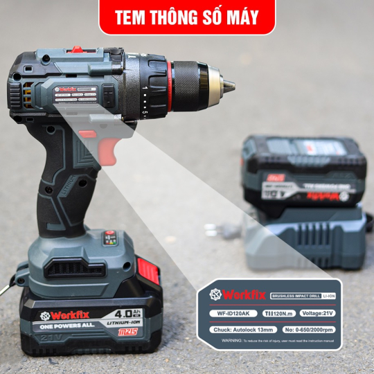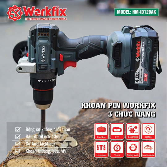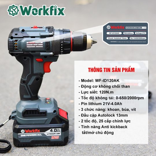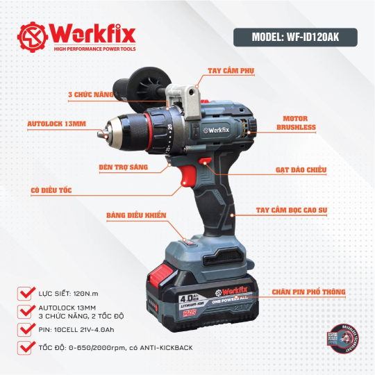 {ANTI-KICKBACK} Máy Khoan Pin 3 Chức Năng 13mm Workfix WF-ID120AK