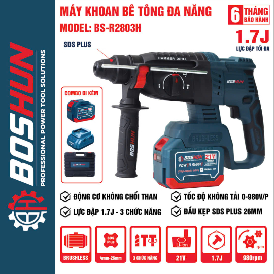 Bạn đang cần một chiếc máy khoan bê tông pin đa năng, cực khỏe, pin trâu, làm việc thoải mái trên cao hay những nơi không có nguồn điện? Boshun BS-R2803H chính là lựa chọn đáng tiền – đáng tin – đáng dùng cho mọi thợ thi công!