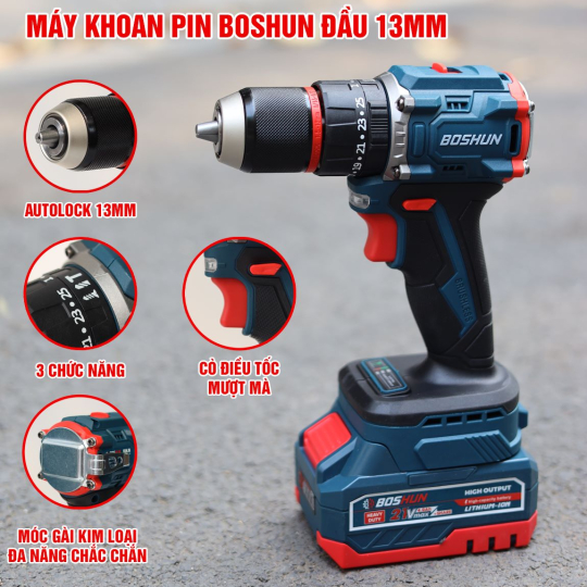 Máy Khoan Pin 13MM Boshun BS-ID1365BL Đa Năng Pin 21V, Lực 65N.m, Động cơ Không Chổi Than