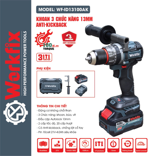 Bạn cần một chiếc máy khoan pin khỏe, đa năng, an toàn tuyệt đối và pin bền bỉ? WorkFix WF-ID13100AK chính là lựa chọn hàng đầu cho anh em thợ công trình, sửa chữa gia đình hay DIY chuyên nghiệp!