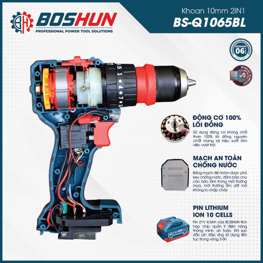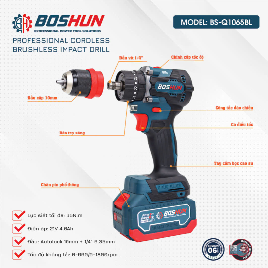 Máy khoan Boshun BS-Q1065BL sử dụng động cơ 100% lõi đồng không chổi than cao cấp, nhông kim loại giúp cho máy hoạt động bền bỉ, tiêu hao ít năng lượng hơn các loại máy thông thường.