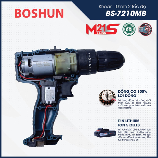 ✔️Máy Khoan Pin Boshun HM-7210MB sử dụng động cơ 100% lõi đồng không chổi than cao cấp, nhông kim loại giúp cho máy có thể hoạt động bền bỉ, tiêu hao ít năng lượng hơn.