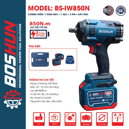 Máy Siết Bulong Boshun BS-IW850N là sản phẩm cao cấp được thiết kế chuyên dụng để siết mở bulong, ốc máy, ốc ô tô tải, và cả các công việc khoan, bắn vít, bắn tôn. Với động cơ không chổi than mạnh mẽ, khả năng chịu tải cao và pin dung lượng lớn, Boshun BS-IW850N là lựa chọn tối ưu cho mọi công trình xây dựng và sửa chữa.